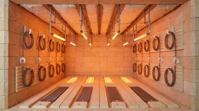 En resumen, los elementos calefactores se soportan físicamente desde las paredes laterales del horno, se suspenden del techo o se colocan en el suelo del horno. Esto se logra utilizando componentes especializados como ganchos cerámicos, colgadores de aleación de alta temperatura, o incrustando los elementos en baldosas refractarias preformadas diseñadas para sujetarlos de forma segura.
