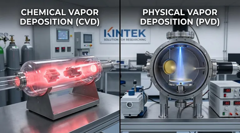 En su esencia, la diferencia entre la deposición química de vapor (CVD) y la deposición física de vapor (PVD) radica en cómo el material de recubrimiento llega al sustrato. La CVD utiliza reacciones químicas a partir de precursores gaseosos para "hacer crecer" una película sobre la superficie, mientras que la PVD transfiere físicamente un material sólido, átomo por átomo, a la superficie en un vacío. Esta distinción determina todo, desde la calidad del recubrimiento hasta los tipos de piezas que pueden recubrirse con éxito.