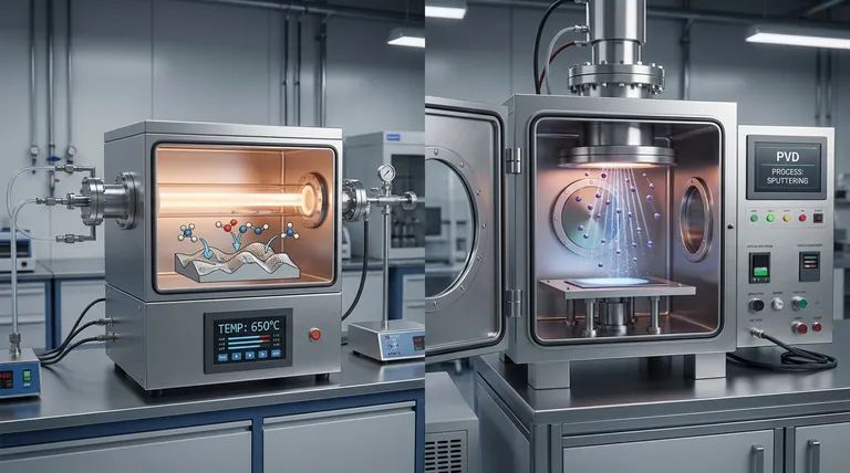 ¿Tiene dificultades para elegir entre CVD y PVD para las necesidades de recubrimiento de su laboratorio? En KINTEK, nos especializamos en soluciones avanzadas de hornos de alta temperatura, incluidos sistemas CVD/PECVD, hornos de mufla, de tubo, rotatorios, de vacío y con atmósfera. Aprovechando nuestra excepcional I+D y fabricación interna, ofrecemos una personalización profunda para satisfacer con precisión sus requisitos experimentales únicos, ya necesite recubrimientos conformados para geometrías complejas o películas metálicas eficientes en superficies planas. ¡Contáctenos hoy para analizar cómo nuestras soluciones personalizadas pueden mejorar su eficiencia en investigación y producción!