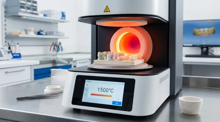 La sinterización no es simplemente calentamiento; es una transformación controlada con precisión. Al calentar un material a una temperatura específica sin fundirlo, el horno hace que sus partículas se fusionen, lo que lleva a una contracción predecible y al desarrollo de la resistencia y estética finales requeridas para una restauración dental duradera.