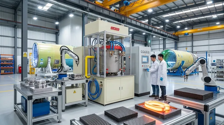 En la industria aeroespacial, el equipo de Prensado en Caliente al Vacío (VHP) es una herramienta de fabricación crítica utilizada para crear componentes de alto rendimiento a partir de materiales avanzados. Es esencial para producir piezas que deben soportar temperaturas extremas y estrés mecánico, como álabes de turbina de matriz cerámica (CMC), elementos estructurales ligeros de matriz metálica (MMC) y escudos térmicos para vehículos hipersónicos. El proceso aplica simultáneamente calor y presión elevados en un vacío para forjar materiales con propiedades inalcanzables mediante métodos convencionales.