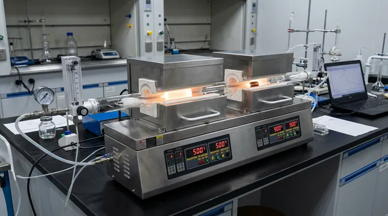 Un horno tubular de doble zona proporciona una separación espacial y temporal crítica entre la descomposición de las materias primas y la formación real de las esferas de carbono. Al utilizar dos zonas de calentamiento controladas de forma independiente, puede pirolizar los precursores a una temperatura más baja en la primera zona mientras activa simultáneamente los catalizadores a una temperatura más alta en la segunda.