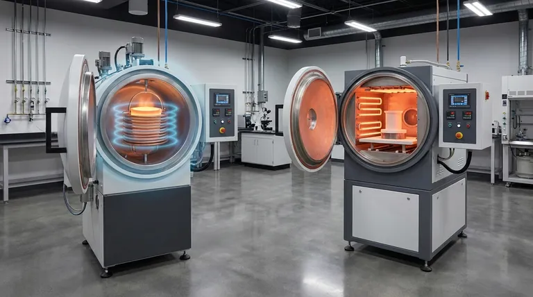 En esencia, los hornos de vacío calentados por inducción y los calentados por resistencia se distinguen por su método fundamental de transferencia de calor. El calentamiento por inducción genera calor directamente dentro del material mediante un campo electromagnético, mientras que el calentamiento por resistencia utiliza elementos calefactores para irradiar calor hacia el material. Esta diferencia fundamental dicta su eficiencia, velocidad y aplicaciones ideales.