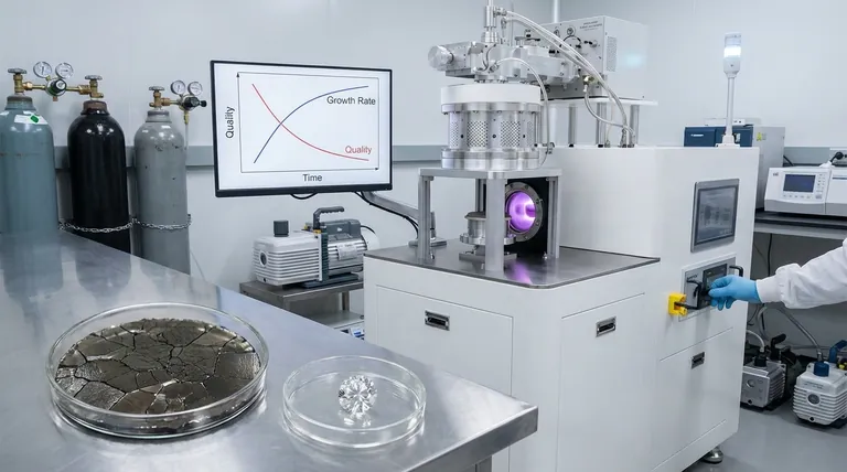 El desafío central de la síntesis de diamantes por MPCVD radica en gestionar una compensación fundamental: las mismas condiciones que aceleran el crecimiento —alta energía y altas concentraciones de gases reactivos— también crean un entorno donde es más probable que se incorporen defectos y formas de carbono no diamantino a la red cristalina.
