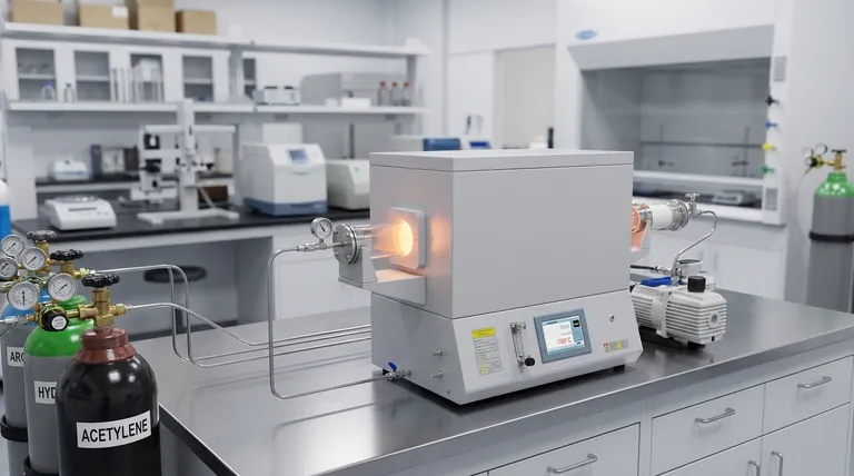El horno no se limita a calentar los materiales; orquesta un proceso catalítico de deposición química de vapor (CVD). Al controlar estrictamente la atmósfera reductora, permite que las partículas de HEA descompongan el acetileno, creando una red conductora 3D unificada que mejora significativamente la estabilidad estructural y la eficiencia del transporte de electrones.